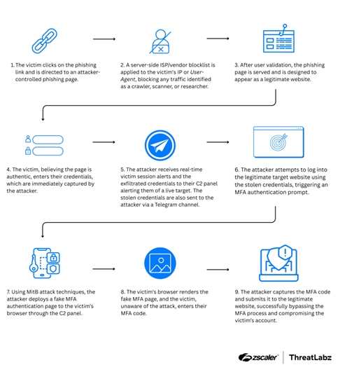 當攻擊者嘗試使用竊取的憑證登入合法網站時,會觸發多因素身份驗證 (MFA) 提示。此時,攻擊者會利用中間人攻擊 (MitB) 技術,透過C2控制面板向受害者的瀏覽器顯示一個偽造的MFA驗證頁面。如果受害者在偽造頁面上輸入MFA驗證碼,攻擊者就會收集並利用該驗證碼非法存取受害者的帳戶。Zscaler:攻擊完成後,受害者會被重定向到合法網站的首頁,從而隱藏攻擊痕跡,確保受害者不會察覺到攻擊。