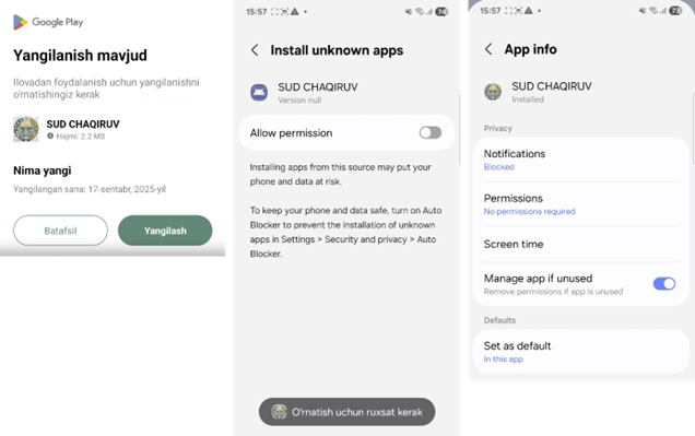 Wonderland惡意軟體主要透過偽造Google Play商店網頁、Facebook廣告、約會應用程式和Telegram等即時通訊應用程式上的虛假帳戶進行傳播。駭客利用在暗網市場出售的竊取的烏茲別克用戶Telegram對話訊息,將APK檔案分發給受害者的聯絡人和聊天記錄。惡意軟體一旦安裝,便可存取簡訊並攔截一次性密碼(one-time password, OTP),該駭客組織利用這些資訊從受害者的銀行卡中竊取資金。此外,該惡意軟體還能取得電話號碼、竊取聯絡人清單、隱藏推播通知以封鎖安全警報或一次性密碼(OTP)提示,甚至還能從受感染的裝置發送簡訊進行橫向移動。然而,側載該應用程式首先需要用戶啟用允許安裝未知來源應用程式的設定。具體做法是顯示一個更新介面,指示使用者安裝更新以使用該應用程式。當受害者安裝APK並授予權限後,駭客會劫持受害者的手機號碼,並嘗試登入與該手機號碼關聯的Telegram帳戶,如果登入成功,傳播過程將重複進行,從而形成循環感染鏈。