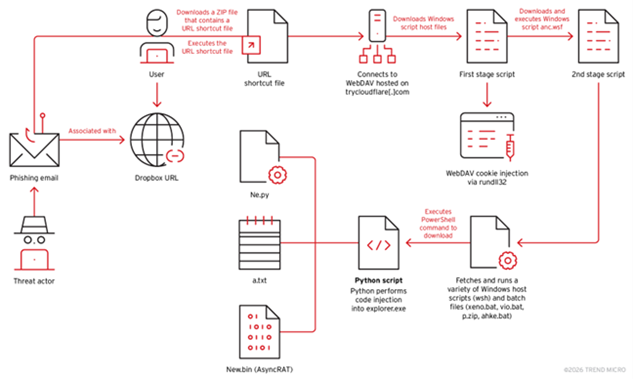 透過在受害者的瀏覽器中創建一個自訂的虛假登入彈出窗口,這種方法利用用戶對身份驗證流程的熟悉程度,使得憑證竊取幾乎無法透過視覺方式檢測到。關鍵轉變在於濫用可信任基礎設施,利用Netlify和Vercel等合法雲端託管服務以及URL縮短服務來繞過傳統安全過濾器,從而為釣魚頁面營造虛假的安全感。攻擊活動利用Python有效載荷和TryCloudflare隧道,透過指向包含網路捷徑(URL)檔案的ZIP壓縮套件Dropbox連結來派送AsyncRAT惡意軟體。 Trend Micro:初始有效載荷是一個Windows腳本宿主(Windows Script Host, WSH) 檔案,旨在下載並執行託管在WebDAV伺服器上的其他惡意腳本。這些腳本會下載批處理檔和其他有效載荷,從而確保無縫且持續的感染過程。