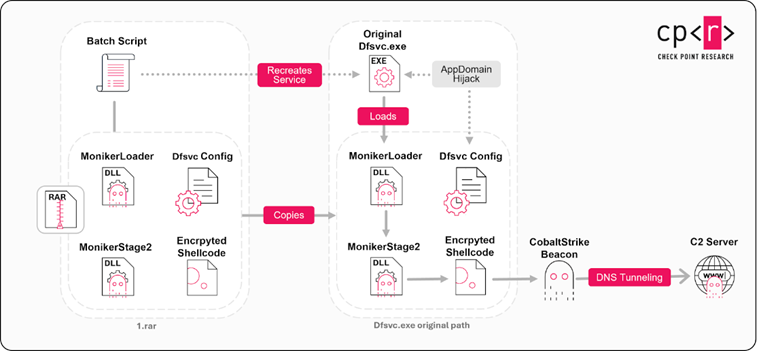 Check Point發現三種不同Cobalt Strike傳播途徑:應用程式網域劫持、服務DLL和電子郵件的網路釣魚。前兩條感染鏈,AppDomain劫持和服務DLL,在操作上存在明顯的重疊,都通過壓縮包傳播,可能用於後滲透場景,在一些案例中,這些感染鏈是在公開暴露的易受攻擊伺服器被攻破後部署的。這兩條感染鏈都使用包含批次腳本RAR壓縮套件。第一條感染鏈利用該腳本投放MonikerLoader,這是一個.NET的載入器,負責解密並在記憶體中直接執行第二階段程式碼。第二階段程式碼則模仿MonikerLoader的行為,充當載入最終Cobalt Strike信標有效載荷的通道。另一方面,服務DLL感染鏈使用批次腳本投放名為BamboLoader的shellcode DLL載入器,該載入器註冊為Windows服務。這是一個高度混淆的C++惡意軟體,用於解密和解壓縮磁碟上儲存的shellcode,並將其註入到合法的 Windows行程中,例如taskhost.exe。注入目標二進位檔案可在 BamboLoader中進行設定。(如圖所示)