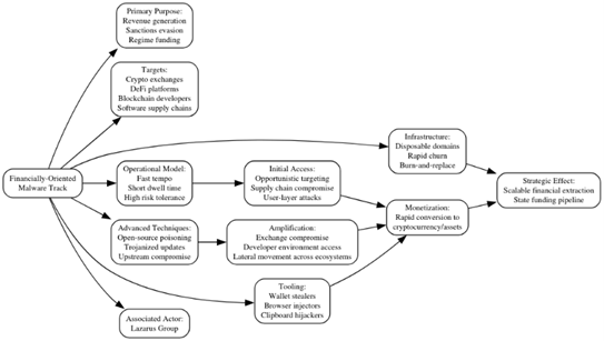 DomainTools:北韓間諜惡意軟體主要與Kimsuky相關,而Lazarus Group則主導著為該政權非法創造收入的活動,並逐漸成為其規避制裁的核心支柱。第三條線索圍繞著部署勒索軟體和抹除型惡意軟體展開,旨在發出策略訊號並展示其能力。這一破壞性分支與Andariel相關。