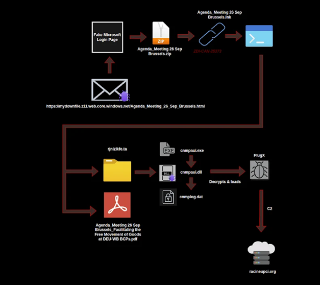 中國關聯駭客組織UNC6384被指控利用未修補Windows捷徑漏洞進行網路攻擊,攻擊目標是歐洲的外交和政府機構,攻擊時間為2025年9月至10月期間。Arctic Wolf網路安全公司於2025年10月30日發布的技術報告指出,攻擊的目標包括匈牙利、比利時、義大利和荷蘭的外交機構,以及塞爾維亞的政府機構等。「攻擊鏈始於包含嵌入式URL魚叉式網路釣魚郵件,這是後續多個初歩階段攻擊,最終擴散歐盟委員會會議、北約相關研討會和多邊外交協調活動相關惡意 LNK 檔」。這些檔案在利用ZDI-CAN-25373漏洞觸發多階段攻擊鏈,最終透過DLL側載部署PlugX惡意軟體。PlugX是一種遠端存取木馬,也被稱為Destroy RAT、Kaba、Korplug、SOGU和TIGERPLUG。